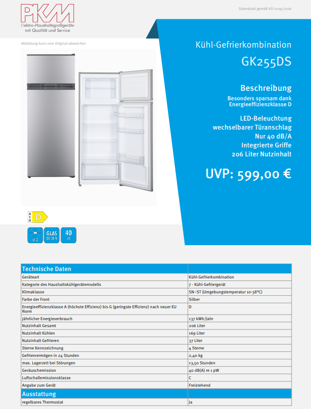 206 Liter Nutzinhalt ( 169 Liter Kühlen – 37 Liter Gefrieren )