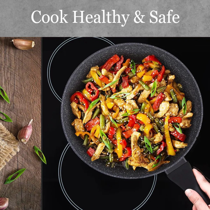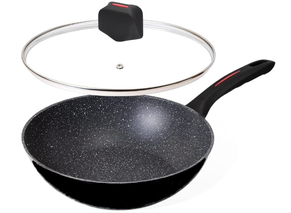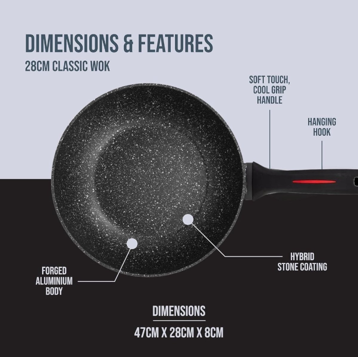 Dieser 28 cm große Wok mit Antihaftbeschichtung ist aus geschmiedeter Aluminiumlegierung gefertigt, die Wärme schnell und gleichmäßig leitet und eine präzise Temperaturregelung ermöglicht. Speisen erhitzen sich schnell und gleichmäßig und lassen sich nach dem Garen mühelos auf den Teller gleiten. Der Wok ist für alle Herdarten geeignet: Gas, Elektro, Keramik, Glaskeramik und Induktion.