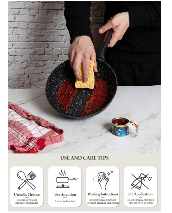 5. Sorgfältig aufbewahren: Legen Sie beim Aufbewahren von Antihaftpfannen oder -töpfen ein weiches Tuch oder Küchenpapier zwischen gestapelte Pfannen, um Kratzer zu vermeiden.