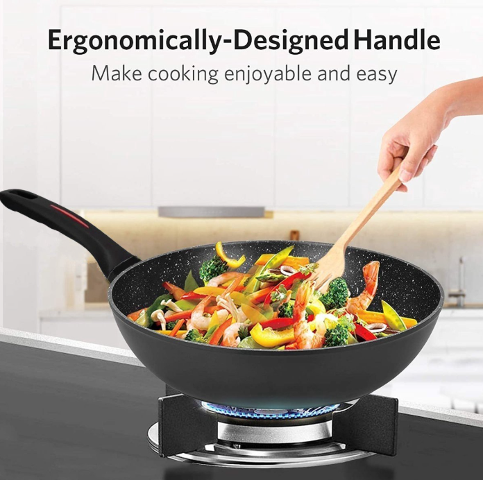 Manche Woks mit Antihaftbeschichtung haben eine strukturierte Oberfläche, wie beispielsweise der Royalty Line Wok. Induktions-Woks mit strukturierter Oberfläche weisen im Allgemeinen geringere Antihafteigenschaften auf als Pfannen mit glatter Oberfläche. Braun, ein Experte für Kochgeschirr, bestätigte: „Ein erhabenes Muster auf einer Antihaftpfanne hebt deren Antihafteigenschaften auf; Speisen neigen dazu, an der Struktur haften zu bleiben.“