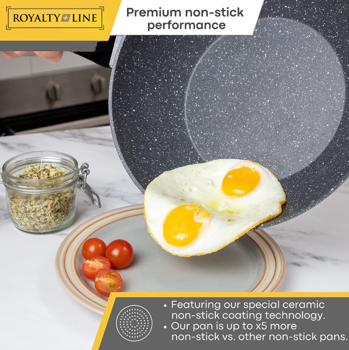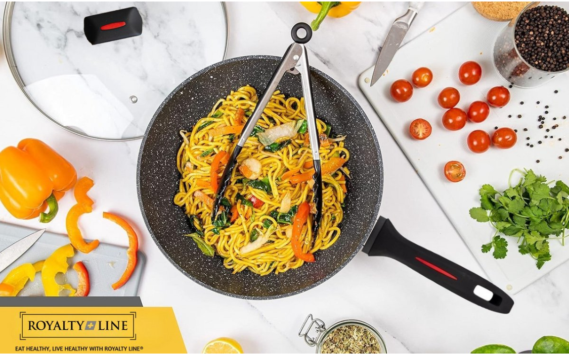 Der Royalty Line Wok mit Antihaftbeschichtung für Induktionsherde verfügt über eine aus Stein gewonnene Titanbeschichtung, die frei von APEO, PFOA und PTFE ist! Dank seiner glatten Innenseite und des flachen Bodens eignet sich dieser Wok für alle Herdarten und ist ideal zum Braten von Eiern, Steaks, Filets, für Wokgerichte und vieles mehr. Perfekt für Zuhause oder die Gastronomie! Ein ideales Geschenk für Freunde und Familie!