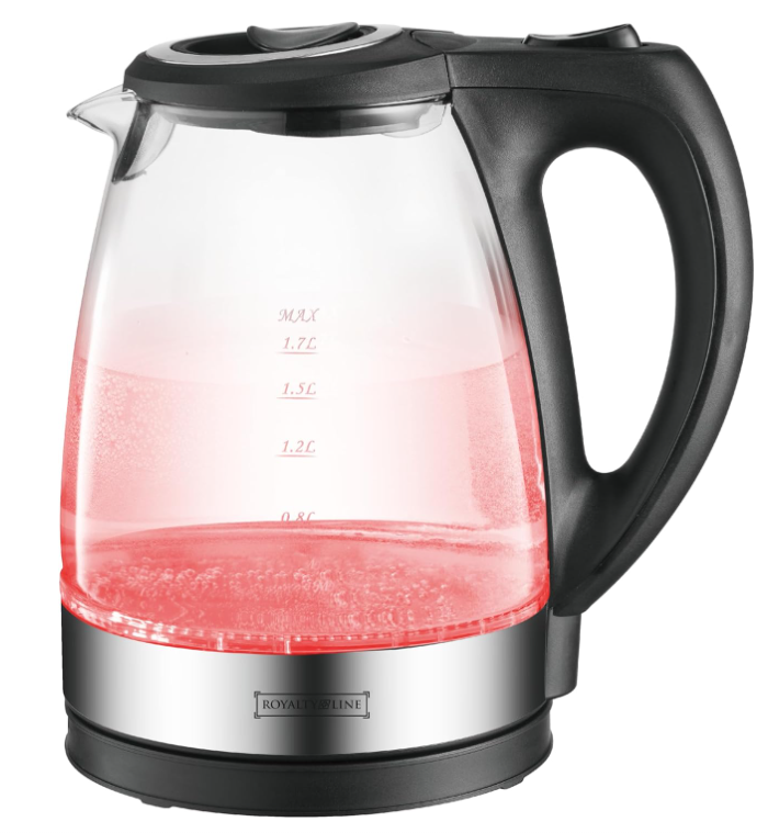 Royalty Line Glas-Wasserkocher 1,7 L, 2200 W, 360°-Sockel, LED-Innenbeleuchtung, Borosilikatglas, BPA-frei, Überhitzungsschutz, automatische Abschaltfunktion, Schnellkochen