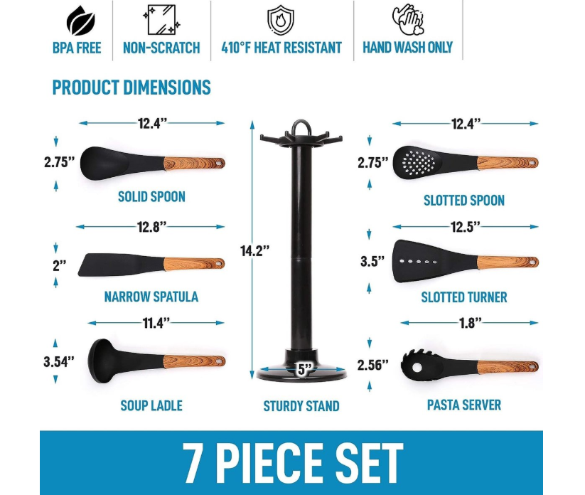 Royalty Line® U03 Küchenutensilien-Set – 7-teiliges Kochgeschirr-Set – BPA-frei – Kochen – Aufhängbar – Hitzebeständig – Mit Drehteller – Küchenset – Holzoptik