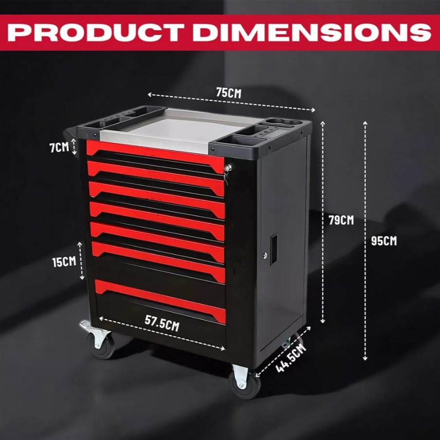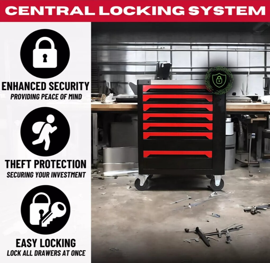 Die robusten Werkzeugschubladen sind voll ausziehbar, sodass Sie auch die Rückseite der Schublade bequem erreichen. Die Schubladen dieses Werkzeugwagens sind nicht mit einer automatischen Schubladenverriegelung ausgestattet. Das Zylinderschloss sorgt dafür, dass Sie alle Werkzeuge nach der Arbeit sicher im Werkzeugwagen verstauen und verschließen können. Dieser Werkzeugwagen ist die ideale Lösung für Hobbymechaniker, die regelmäßig an Autos arbeiten.