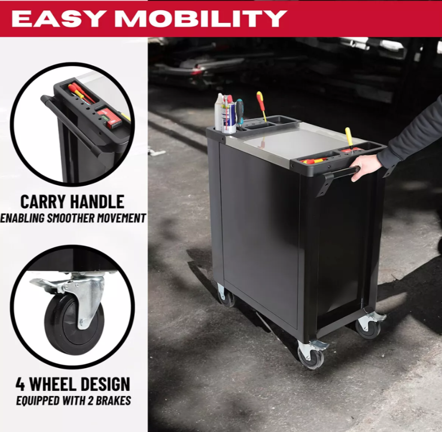 Der Werkzeugwagen lässt sich dank der vier kugelgelagerten Räder, davon zwei Lenkrollen mit Feststellbremse, leicht bewegen.